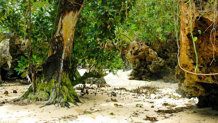 Une magnifique plage de sable blanc bordée de récifs coralliens et un lac d'eau salée entouré par une forêt de mangrove.